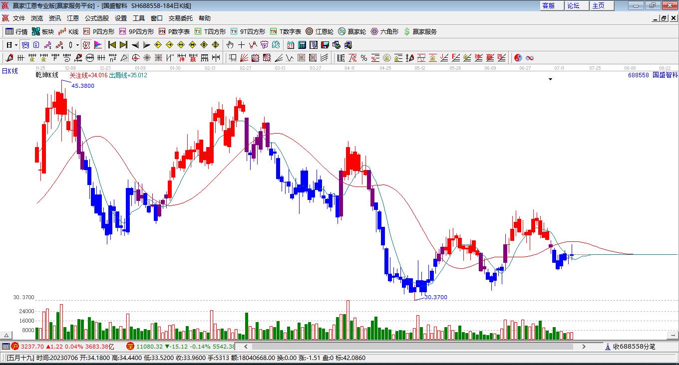 國(guó)盛智科處于贏家江恩多頭主線(xiàn)形態(tài),從11月21日形成底分型后持續(xù)上攻,今日突破前高形成初次江恩筑底信號(hào),中期雖然處于回調(diào)中,但長(zhǎng)期多頭趨勢(shì)延續(xù)。國(guó)盛智科今日高開(kāi)0.0元,截止目前小幅上漲5.47%,K