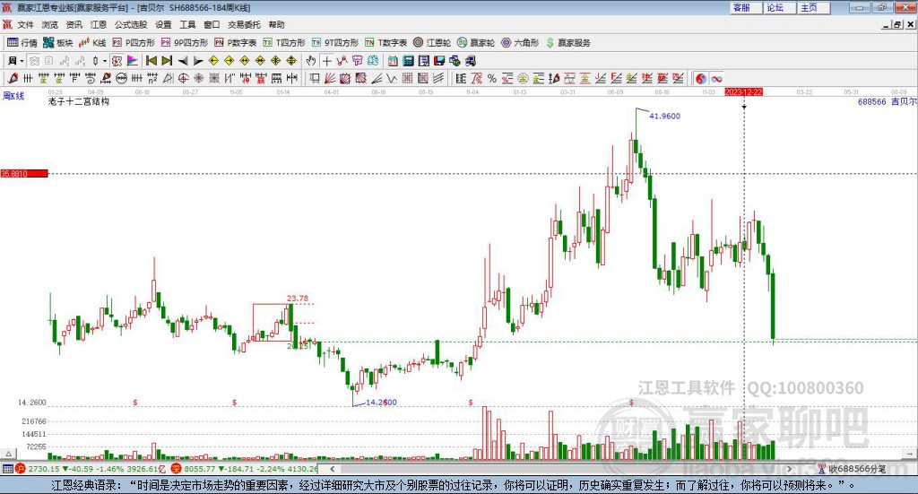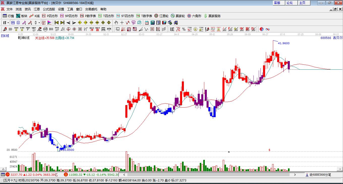 688566吉貝爾處于贏家江恩多頭中期回調(diào)形態(tài),9月26日發(fā)出江恩筑頂信號后,經(jīng)過49日,今日再次發(fā)出江恩底分型并發(fā)出江恩筑底信號,中期雖然處于下跌中,但長期多頭趨勢延續(xù)。吉貝爾今日低開,截止目前微漲