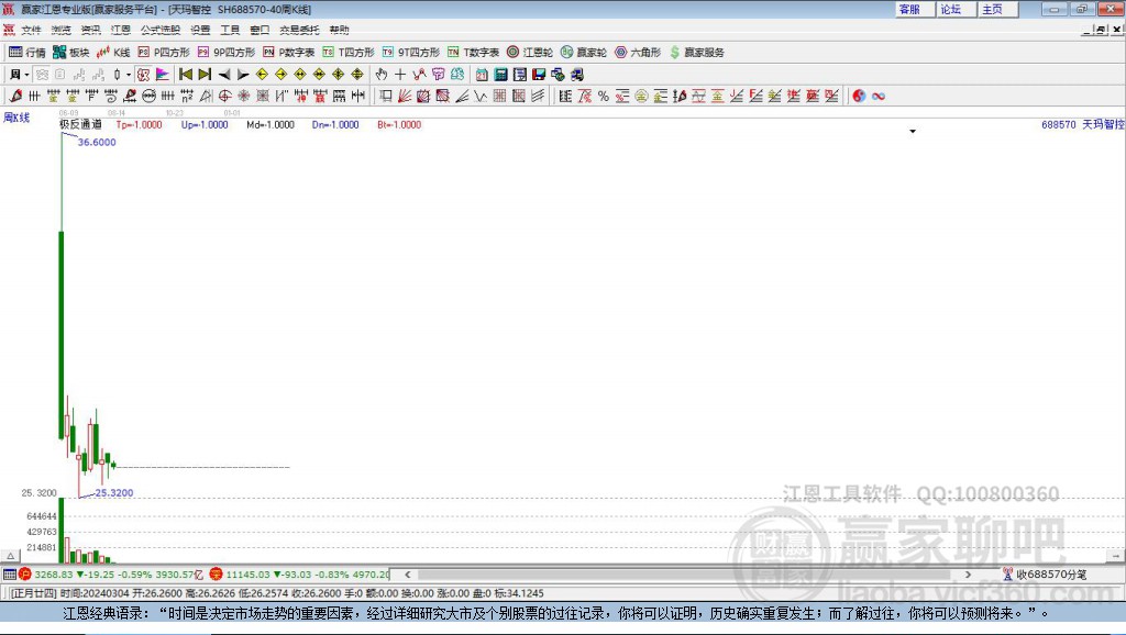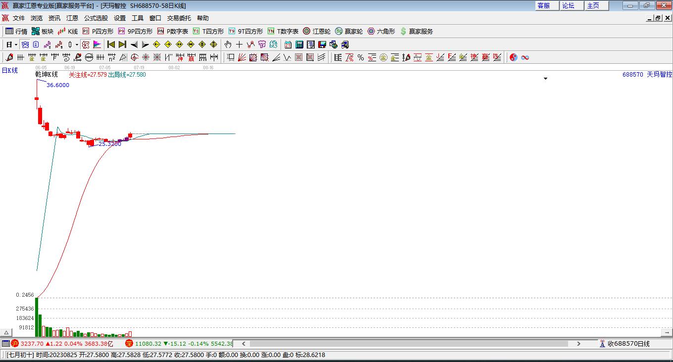 688570天瑪智控處于贏家江恩空頭主線形態(tài),今日雖重心上移,但短期空頭趨勢未改變,11月10日發(fā)出中期江恩筑底信號后,經(jīng)過84日,今日形成中期筑頂信號,注意風(fēng)險(xiǎn)規(guī)避。天瑪智控今日跳空高開,截止目前雖