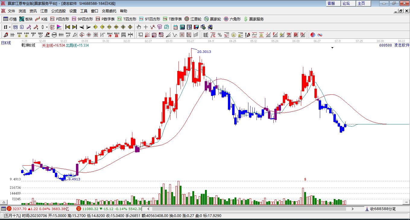 凌志軟件(688588)處于贏家江恩多頭次主線形態(tài),1月6日發(fā)出江恩筑底信號后,經(jīng)過21日,今日形成短期筑頂信號,短期多頭趨勢已被破壞,中期多頭趨勢延續(xù),但長期處于回調(diào)中。凌志軟件今日跳空低開,截止目