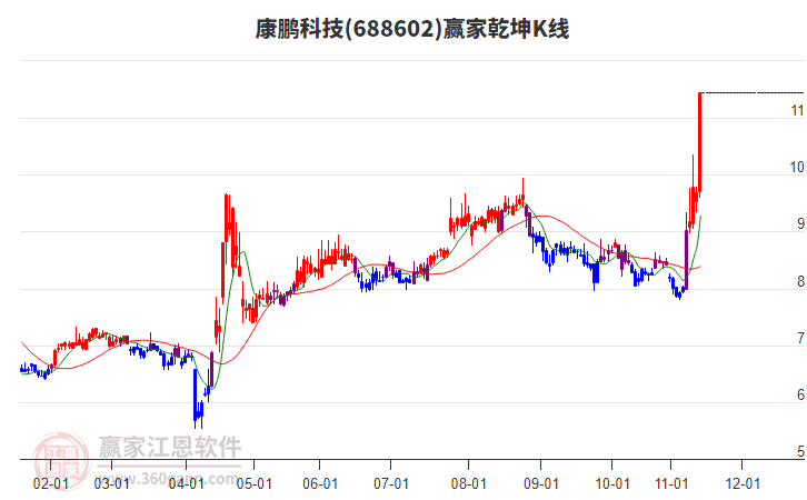 康鵬科技(688602)處于贏家江恩多頭主線形態(tài),12月11日發(fā)出江恩筑頂信號后,經(jīng)過26日,今日再次發(fā)出江恩底分型并發(fā)出江恩筑底信號,中長期多頭趨勢依舊保持??爹i科技今日跳空高開,截止目前K線光腳小