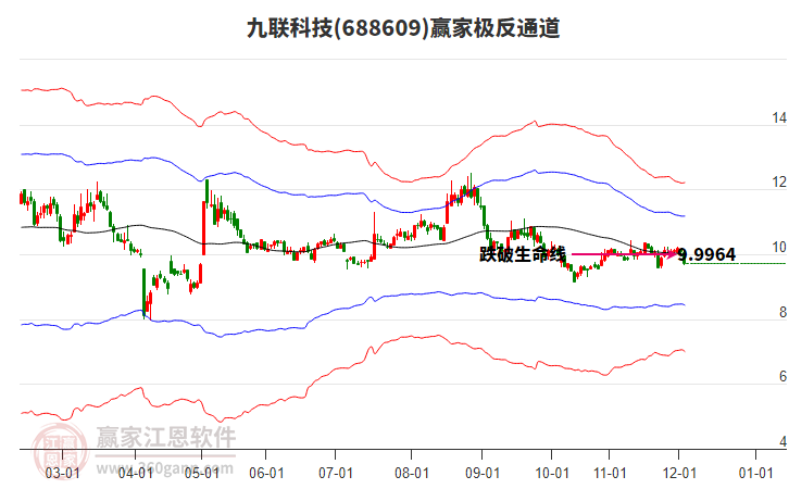 依據(jù)贏家江恩系統(tǒng)趨勢(shì)工具極反通道分析判斷九聯(lián)科技688609運(yùn)行在生命線以下弱勢(shì)區(qū)域,根據(jù)規(guī)則該股短線輕倉參與,股價(jià)跌至弱勢(shì)外軌線后波段再結(jié)合其它工具信號(hào)建倉。應(yīng)用口訣是:生命線上強(qiáng)勢(shì)走,生命線下難抬頭;紅黃兩條外軌線,壓力支撐顯勢(shì)頭。
