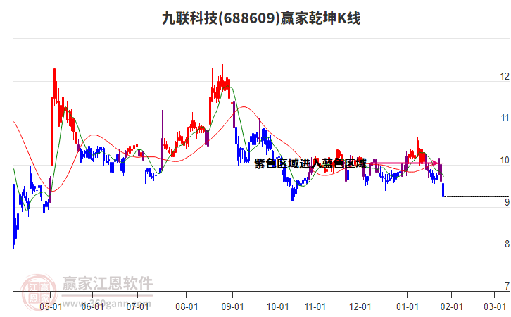 688609九聯(lián)科技處于贏家江恩空頭主線形態(tài),今日重心持續(xù)下移,短期延續(xù)下跌趨勢(shì),從1月9日形成中期頂分型后中期重心持續(xù)下移,今日跌破前低形成初次筑頂信號(hào),注意風(fēng)險(xiǎn)規(guī)避。九聯(lián)科技今日跳空低開,截止目前