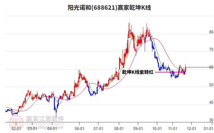 11月25日688621陽光諾和最高價64.5上穿了贏家極反通道工具生命線,受到生命線強力壓制,最終收盤停留在在生命線與藍色下軌線上方的弱勢通道區(qū)域。688621陽光諾和近10個交易日漲幅8.35%。