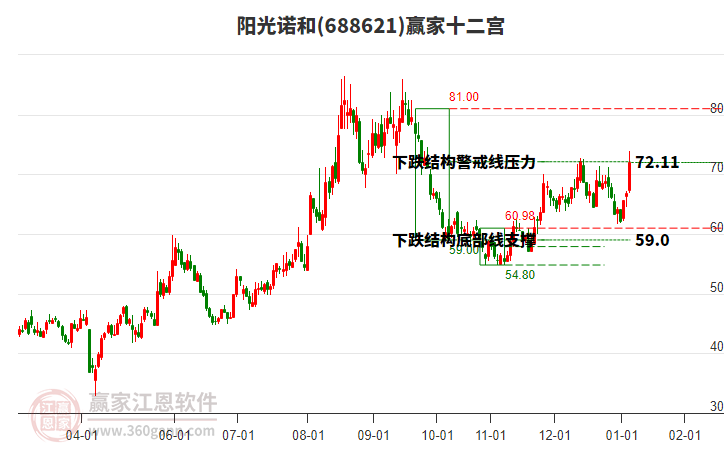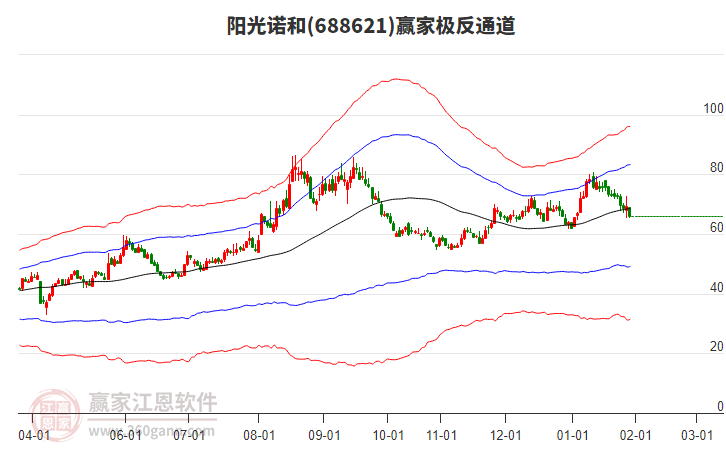 依據(jù)贏家江恩系統(tǒng)趨勢工具極反通道分析判斷陽光諾和688621運行在生命線以下弱勢區(qū)域,根據(jù)規(guī)則該股短線輕倉參與,股價跌至弱勢外軌線后波段再結(jié)合其它工具信號建倉。應(yīng)用口訣是:生命線上強勢走,生命線下難抬頭;紅黃兩條外軌線,壓力支撐顯勢頭。