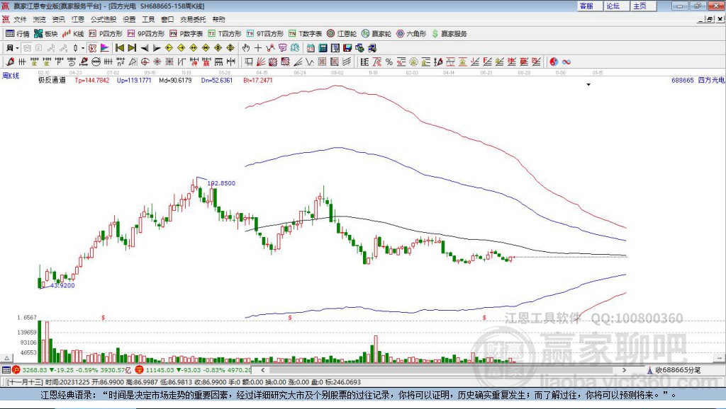 688665四方光電處于贏家江恩多頭中期回調(diào)形態(tài),從12月12日形成頂分型后持續(xù)下跌,重心下移,今日跌破前低形成短期初次筑頂信號(hào),短期多頭趨勢已被破壞,中期多頭反彈趨勢延續(xù),但長期處于回調(diào)中。四方光電