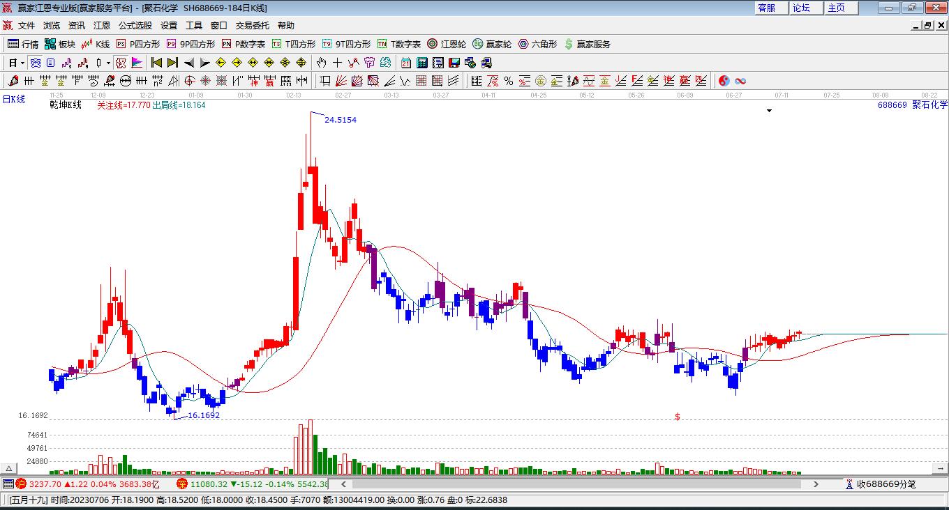 聚石化學(688669)處于贏家江恩多頭主線形態(tài),今日重心上移,短期持續(xù)上漲,從11月24日形成中期底分型后,行情經(jīng)歷一波上漲,突破前高形成中期初次筑底信號,長期處于多頭上漲趨勢。聚石化學今日跳空高開