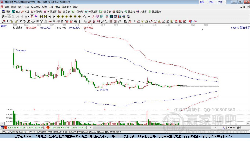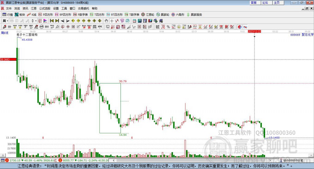 688669聚石化學處于贏家江恩多頭次主線形態(tài),12月29日發(fā)出江恩筑底信號后,經(jīng)過29日,今日形成短期筑頂信號,短期多頭趨勢已被破壞,中長期多頭趨勢依舊保持。聚石化學今日跳空低開,截止目前K線呈現(xiàn)下