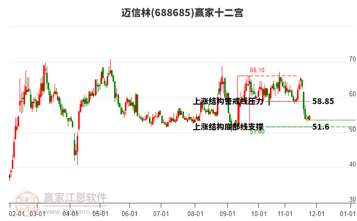 依據(jù)贏家江恩系統(tǒng)趨勢工具極反通道分析判斷邁信林688685運行在生命線以上強勢區(qū)域,根據(jù)規(guī)則該股可短線、波段結(jié)合操作;結(jié)合物極必反的原理通過分鐘圖做盤中差價,應(yīng)用口訣是:生命線上強勢走,生命線下難抬頭;紅黃兩條外軌線,壓力支撐顯勢頭。