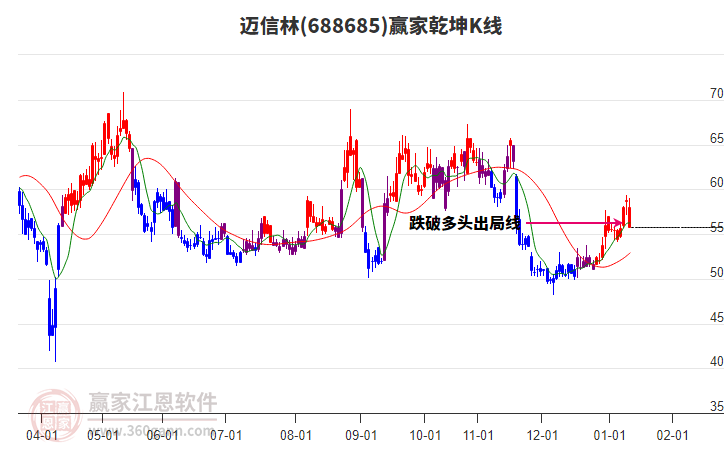 邁信林(688685)處于贏家江恩多頭中期回調(diào)形態(tài),從1月12日形成頂分型后持續(xù)下跌,重心下移,今日跌破前低形成短期初次筑頂信號,短期多頭趨勢已被破壞,中期多頭反彈趨勢延續(xù),但長期處于回調(diào)中。邁信林今