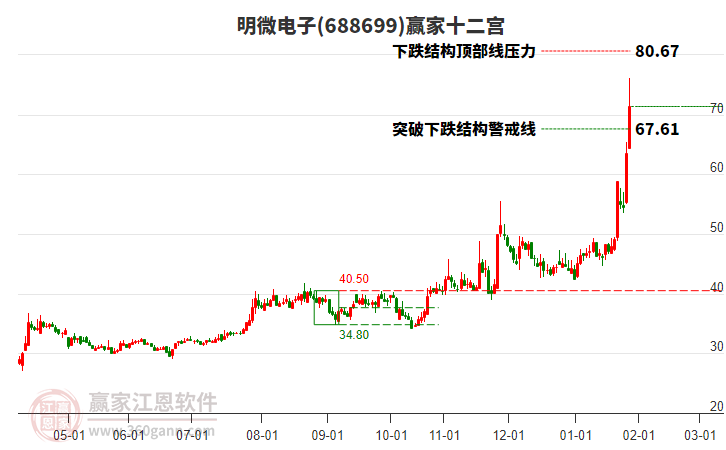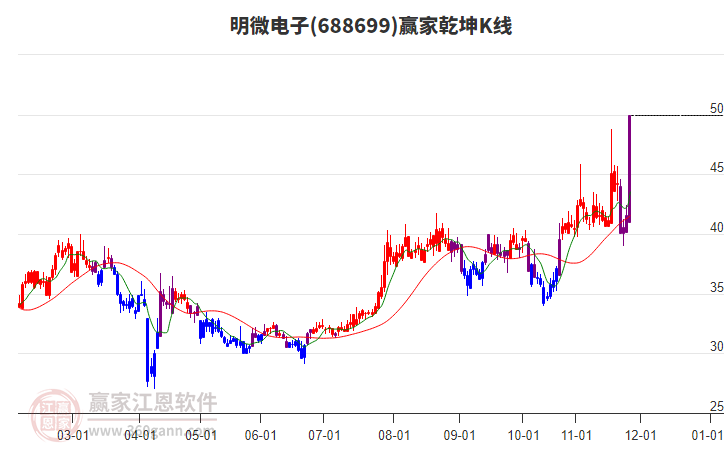 明微電子(688699)處于贏家江恩多頭次主線形態(tài),1月6日發(fā)出江恩筑底信號后,經(jīng)過34日,今日形成短期筑頂信號,短期多頭趨勢已被破壞,中長期多頭趨勢依舊保持。明微電子截止目前雖依舊為下影小陰線,但目