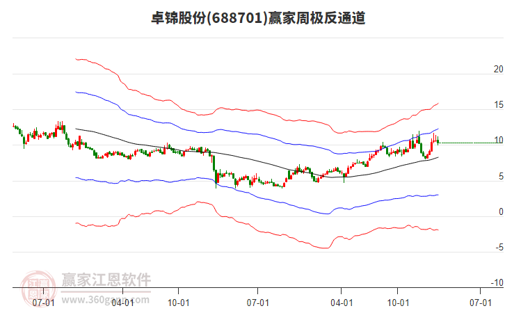 周一卓錦股份688701最高價12.01上穿了贏家極反通道工具藍色外軌線,受到藍色外軌線強力壓制,最終收盤停留在在藍色外軌線與生命線上方的強勢通道區(qū)域。卓錦股份688701近10個交易日漲幅19.2%