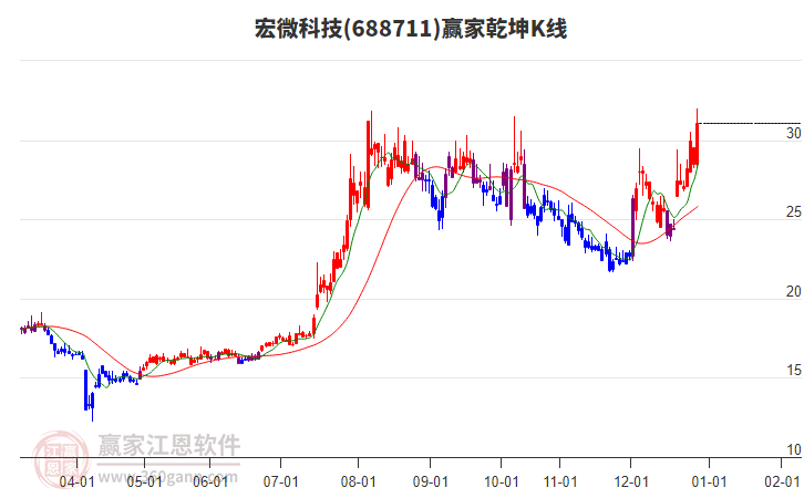 688711宏微科技處于贏家江恩多頭主線形態(tài),今日重心上移,短期持續(xù)上漲,從11月24日形成中期底分型后,行情經(jīng)歷一波上漲,突破前高形成中期初次筑底信號,長期處于多頭上漲趨勢。688711宏微科技目前