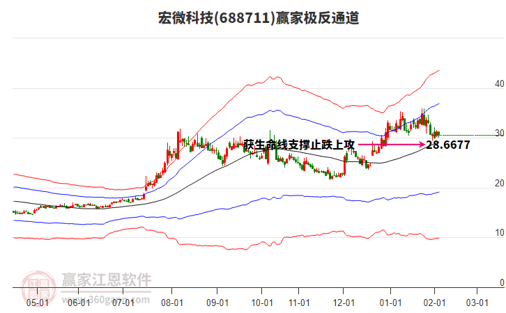 依據(jù)贏家江恩系統(tǒng)趨勢工具極反通道分析判斷宏微科技688711運行在生命線以下弱勢區(qū)域,根據(jù)規(guī)則該股短線輕倉參與,股價跌至弱勢外軌線后波段再結(jié)合其它工具信號建倉。應(yīng)用口訣是:生命線上強(qiáng)勢走,生命線下難抬頭;紅黃兩條外軌線,壓力支撐顯勢頭。