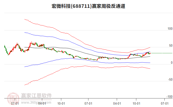目前688711宏微科技最高價33.38上穿了贏家極反通道工具藍色外軌線,受到藍色外軌線強力壓制,最終收盤停留在在藍色外軌線與生命線上方的強勢通道區(qū)域。688711宏微科技近10個交易日漲幅3.21%