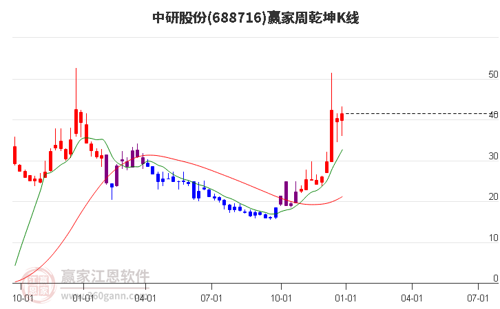 中研股份(688716)處于贏家江恩多頭中期回調(diào)形態(tài),從1月20日形成頂分型后持續(xù)下跌,重心下移,今日跌破前低形成短期初次筑頂信號,短期多頭趨勢已被破壞,中長線均在空頭下跌趨勢中。中研股份今日跳空低開
