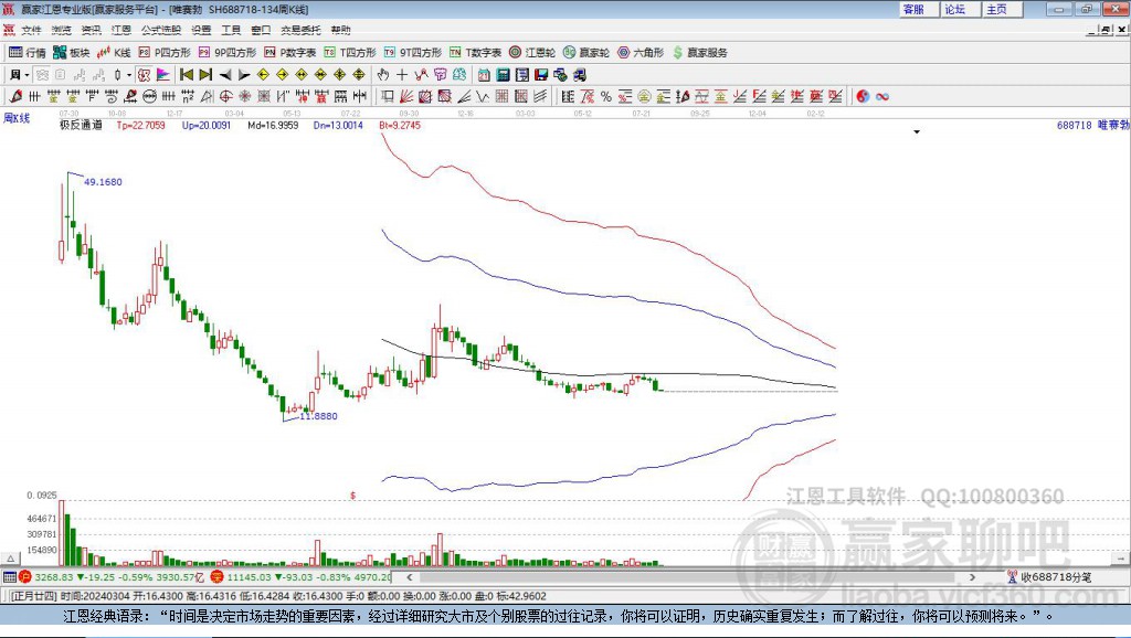依據(jù)贏家江恩極反通道趨勢工具展示,本周股價處于生命線上強勢通道,本周收盤價14.77,自近期通道內(nèi)低點12.84上漲至本周,到達生命線13.1199點上方,短期關注此線支撐,如支撐不破,保持在強勢通道內(nèi),波段繼續(xù)看多,有望挑戰(zhàn)藍色上軌線。若跌破生命線13.1199,進入弱勢通道,調(diào)整周期繼續(xù)延長。