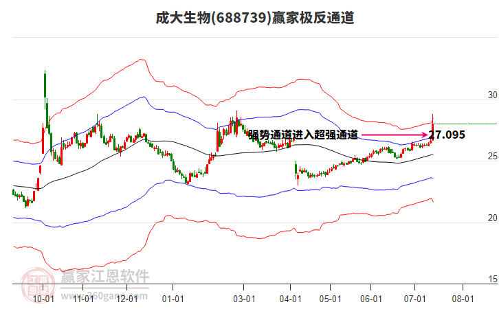 依據(jù)贏家江恩系統(tǒng)趨勢工具極反通道分析判斷成大生物688739運行在生命線以下弱勢區(qū)域,根據(jù)規(guī)則該股短線輕倉參與,股價跌至弱勢外軌線后波段再結合其它工具信號建倉。應用口訣是:生命線上強勢走,生命線下難抬頭;紅黃兩條外軌線,壓力支撐顯勢頭。