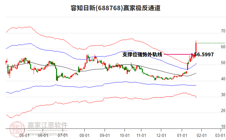 今天688768容知日新最高價(jià)51.55上穿了贏家極反通道工具上方紅色外軌線,受到上方紅色外軌線強(qiáng)力壓制,最終收盤(pán)停留在在上方紅色外軌線與藍(lán)色外軌線上方的超強(qiáng)通道區(qū)域。688768容知日新近10個(gè)交易