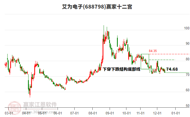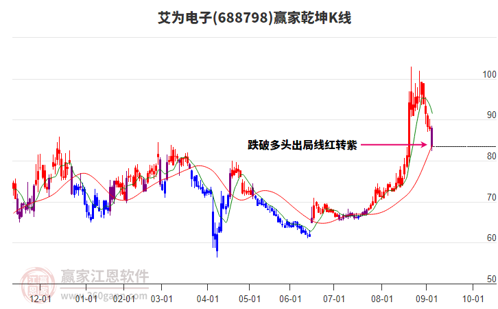 688798艾為電子處于贏家江恩多頭次主線形態(tài),從1月20日形成頂分型后持續(xù)下跌,重心下移,今日跌破前低形成短期初次筑頂信號(hào),短期多頭趨勢(shì)已被破壞,中期多頭趨勢(shì)延續(xù),但長期處于回調(diào)中。艾為電子今日低開