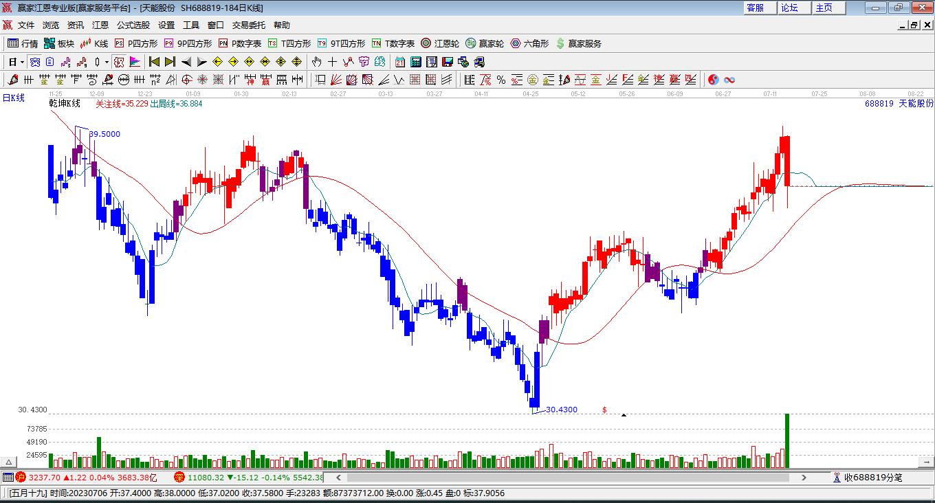 天能股份處于贏家江恩多頭中期回調(diào)形態(tài),12月30日發(fā)出江恩筑頂信號(hào)后,經(jīng)過(guò)7日,今日再次發(fā)出江恩底分型并發(fā)出江恩筑底信號(hào),中期雖然處于下跌中,但長(zhǎng)期多頭趨勢(shì)延續(xù)。天能股份今日跳空高開(kāi),截止目前K線陽(yáng)十