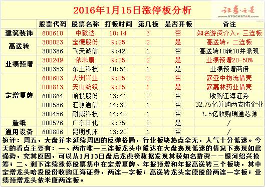 周五,大盤(pán)并未延續(xù)周四的反彈格局,行業(yè)板塊熱點(diǎn)全無(wú),人氣十分低迷。今天的看點(diǎn)主要有:一、兩市唯一三連板龍頭中毅達(dá)在大盤(pán)表現(xiàn)低迷的情況下表現(xiàn)如此強(qiáng)勢(shì),究其原因,可以從1月13日盤(pán)后龍虎榜數(shù)據(jù)發(fā)現(xiàn)其獲知名游資——銀河紹興搶籌;二、剩下連續(xù)漲停股票集中在定增復(fù)牌、年報(bào)預(yù)增和年報(bào)高送轉(zhuǎn)三個(gè)板塊,其中定增龍頭哈投股份收購(gòu)江海證券,兩連一字板;高送轉(zhuǎn)龍頭寶德股份兩連一字板;業(yè)績(jī)預(yù)增龍頭依米康兩連板。