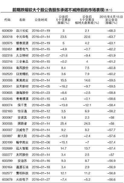 在2015年6月15日至承諾不減持公告日跌幅最大的25只股票中,有15只股票在公告后5個(gè)交易日錄得上漲,占比為60%;有16只股票在公告后5個(gè)交易日跑贏大盤(pán),占比為64%,如表1。