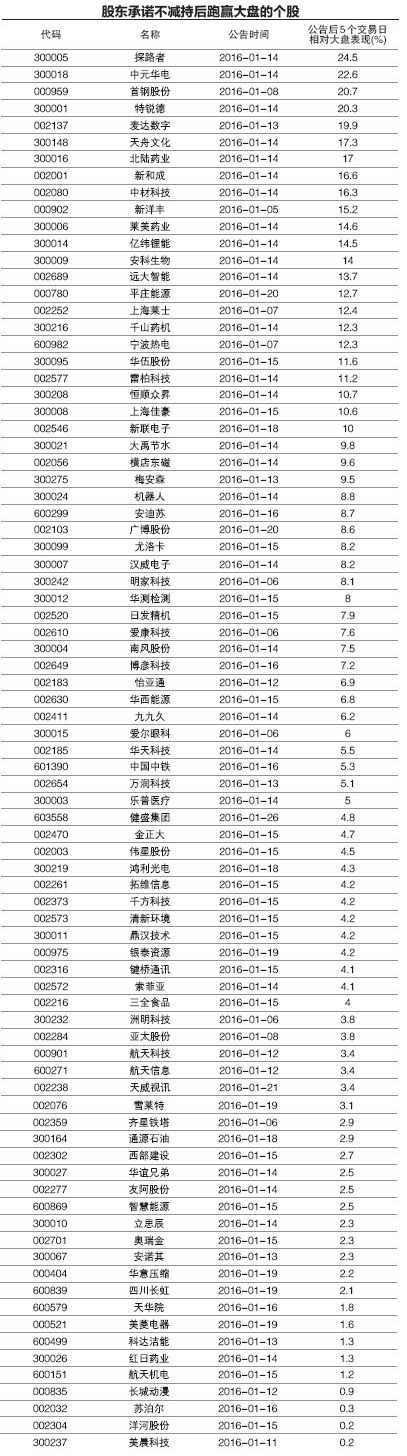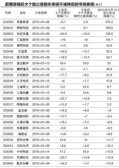 在2015年6月15日至承諾不減持公告日漲幅最大的25只股票中,卻只有5只股票在公告后5個(gè)交易日錄得上漲,占比為20%;只有10只股票在公告后5個(gè)交易日跑贏大盤(pán),占比為40%,如表2。