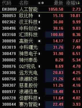 近日,國務(wù)院印發(fā)《新一代人工智能發(fā)展規(guī)劃》,提出了面向2030年我國新一代人工智能發(fā)展的指導(dǎo)思想、戰(zhàn)略目標(biāo)、重點任務(wù)和保障措施,部署構(gòu)筑我國人工智能發(fā)展的先發(fā)優(yōu)勢,加快建設(shè)創(chuàng)新型國家和世界科技強國,并明確指出人工智能成為國際競爭的新焦點,截至目前13:15分,板塊漲幅2.73%。個股表現(xiàn)如下: