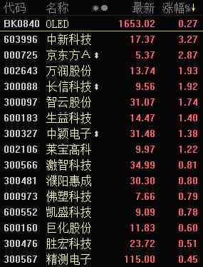 OLED全面屏?xí)r代已經(jīng)來臨 概念股騰飛在即京東方A(000725):三季報大超預(yù)期 大尺寸液晶和柔性oled齊頭并進(jìn)萬潤股份(002643):產(chǎn)品布局能力強(qiáng) OLED與環(huán)保材料需求強(qiáng)勁智云股份(300097) :3C自動化帶動公司業(yè)績高增長生益科技(600183) :淡季不淡彰顯成長價值 旺季再臨全年業(yè)績高增長可期