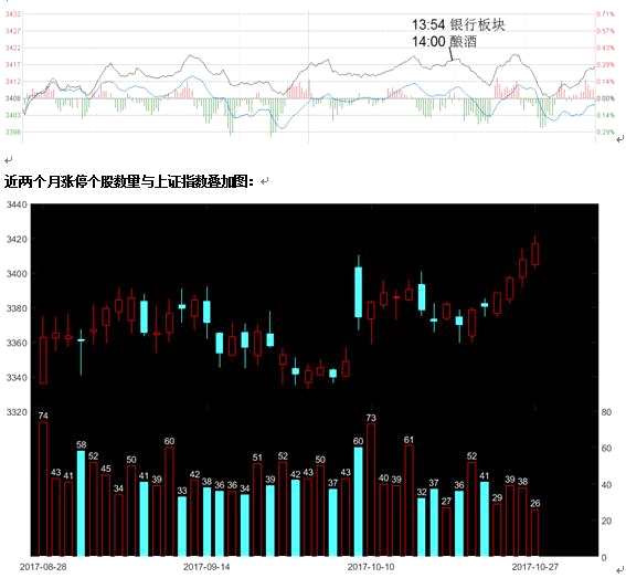 10月27日(周五),上證指數(shù)小幅低開(kāi)后震蕩,最高3421.1點(diǎn),刷新年內(nèi)高點(diǎn),截至收盤(pán)上漲0.27%,走出4連陽(yáng)形態(tài)。盤(pán)面上銀行、保險(xiǎn)等權(quán)重拉升,題材股則普遍走弱。中小板和創(chuàng)業(yè)板則分別下跌0.46%和0.76%,兩市上漲的個(gè)股共有877只,下跌的個(gè)股有2243只。板塊方面,銀行板塊表現(xiàn)較好,受茅臺(tái)業(yè)績(jī)超預(yù)期增長(zhǎng),股價(jià)創(chuàng)655元新高影響,釀酒板塊也強(qiáng)勢(shì)上漲。個(gè)股方面,兩市共計(jì)26只個(gè)股漲停,個(gè)股漲停數(shù)量創(chuàng)51個(gè)交易日以來(lái)的新低,其中新股有19只,漲停的老股中,滬市主板有3只,深市主板有1只,中小板有1只,創(chuàng)業(yè)板有2只。
