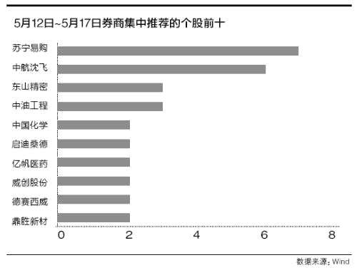 5月12日~5月17日券商集中推薦的股票前四名為:蘇寧易購(002024)(行情002024,診股)、中航沈飛(600760)(行情600760,診股)、東山精密(002384) (行情002384,診股)、中油工程(600339)(行情600339,診股),這四家公司分別屬于深圳A股和上海A股。