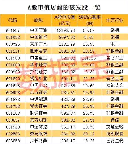 破發(fā)股中,不乏行業(yè)龍頭股。如石油行業(yè)龍頭中國石油(601857,股吧)(行情601857,診股),最新A股市值1.22萬億元;煤炭行業(yè)龍頭中國神華(601088,股吧)(行情601088,診股),最新A股市值3097億元。此外,還有元器件行業(yè)龍頭京東方A(000725,股吧)(行情000725,診股),券商行業(yè)龍頭之一國泰君安(601211,股吧)(行情601211,診股),軍工行業(yè)龍頭中國重工(601989,股吧)(行情601989,診股),有色行業(yè)龍頭之一紫金礦業(yè)(601899,股吧)(行情601899,診股)等。部分破發(fā)股在股價連續(xù)下跌后,最新A股市值不足10億元,如*ST圣萊(002473,股吧)(行情002473,診股)、*金亞(300028,股吧)、退市昆機(jī)(600806,股吧)(行情600806,診股)。