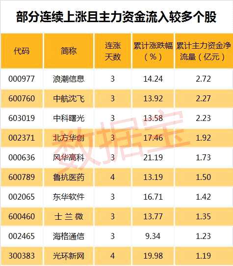 值得注意的是,380只連續(xù)上漲個股中,11只個股期間主力資金累計凈流入超過億元。其中,累計資金流入最多的為浪潮信息(000977,股吧)(行情000977,診股),主力資金累計流入2.72億元。