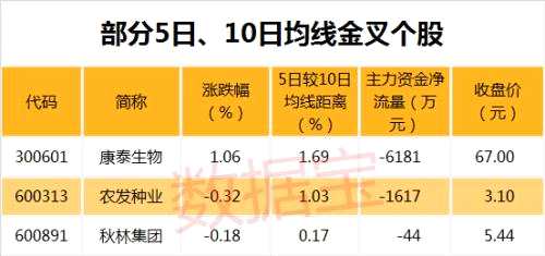 截至7月3日收盤,有3只A股的5日均線主動上穿10日均線,其中康泰生物(300601,股吧)(行情300601,診股)、農(nóng)發(fā)種業(yè)(600313,股吧)(行情600313,診股)、秋林集團(tuán)(600891,股吧)(行情600891,診股)等個股的5日均線較10日均線距離最大,分別達(dá)1.69%、1.03%、0.17%。