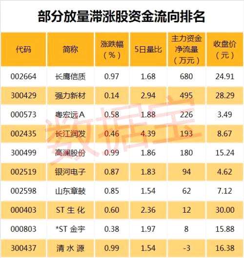 值得注意的是,33只放量滯漲股中,長鷹信質(zhì)(002664,股吧)(行情002664,診股)、強(qiáng)力新材(行情300429,診股)、粵宏遠(yuǎn)A(000573,股吧)(行情000573,診股)、長江潤發(fā)、高瀾股份(300499,股吧)(行情300499,診股)等個股主力資金凈流入較多。