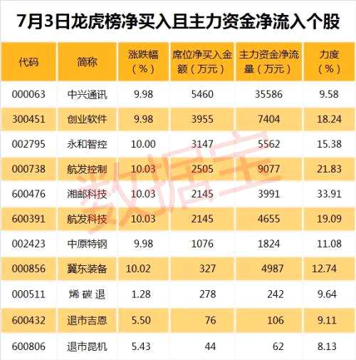 7月3日龍虎榜中機(jī)構(gòu)及營業(yè)部席位資金凈賣出10.22億元,其中凈買入的個股有13只;凈賣出的個股有25只。凈買入前三名個股分別是中興通訊(000063,股吧)(行情000063,診股)、創(chuàng)業(yè)軟件(300451,股吧)(行情300451,診股)、永和智控(002795,股吧)(行情002795,診股)等,凈買入金額占當(dāng)日成交額比例達(dá)1.47%、9.74%、8.70%。