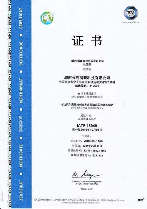IATF16949:2016是汽車行業(yè)公認(rèn)的國際質(zhì)量管理標(biāo)準(zhǔn)之一,以體系完備、嚴(yán)格而著稱,用于汽車制造與汽車供應(yīng)鏈的評審與認(rèn)證。該證書的獲得,標(biāo)志著長高潤新高壓盒和線束產(chǎn)品的設(shè)計生產(chǎn),已經(jīng)完全和國際汽車領(lǐng)域接軌,能夠更好的為業(yè)界提供配套產(chǎn)品和優(yōu)質(zhì)服務(wù)。
