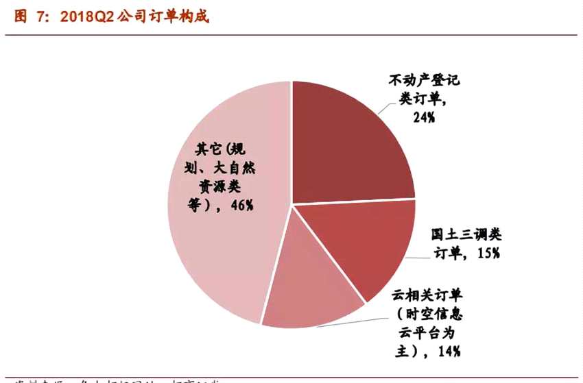 國土三調(diào)接力不動產(chǎn)登記支撐業(yè)績:細分看,不動產(chǎn)登記相關(guān)訂單金額占總體比重開始下降(2018Q2不動產(chǎn)登記類訂單總金額為4368萬,占比24%),但公司訂單總金額依舊實現(xiàn)了良好增長。原因在于國土三調(diào)相關(guān)訂單開始出現(xiàn)(總金額2790萬,占比15%),且以時空信息云平臺為代表的云業(yè)務(wù)相關(guān)訂單(總金額2577萬,占比14%)等“非不動產(chǎn)登記”類的訂單占比開始快速崛起。