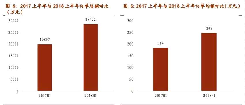 據(jù)統(tǒng)計,2018上半年公司整體獲單金額為2.84億,同比增長43.13%。此外,訂單均額同比增長34.42%。