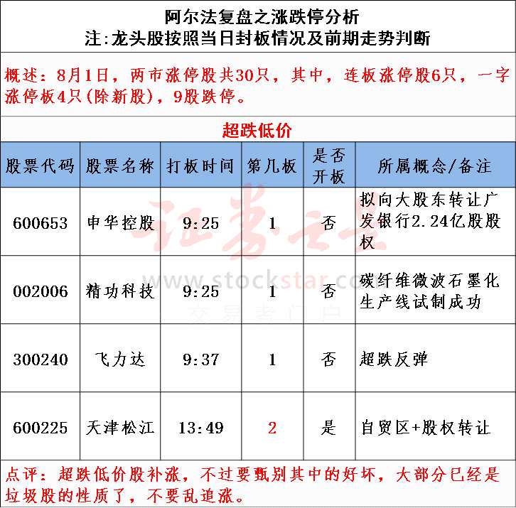 指數(shù)在7月下旬三連陽后馬上就是一波4連陰,最關(guān)鍵的因素還是量能的維系,雖然有過局部5000億元的巨量,但隨后連續(xù)縮量,甚至一度跌破3000億元。近期出現(xiàn)了明顯的普跌走勢,尤其是創(chuàng)業(yè)板的破位下跌嚴重打擊市場人氣,而權(quán)重護盤讓主板看上去還不算太差。此外,繼【長生生物(002680)、 從過去歷史來看,每當中國實體經(jīng)濟面臨下滑的嚴峻形勢,管理層便會刺激基建投資穩(wěn)增長,此次央行和財政部的做法與之前如出一轍,跟大基建相關(guān)的資源板塊如鋼鐵、水泥、煤炭、有色等附屬產(chǎn)業(yè)鏈都將受益。但實際上,這一次還是不同的,并沒有大放水,只是加快年初額度的落實,因此市場經(jīng)歷初期普漲過后,近期是有一個重新梳理和甄別的過程。這里面還是有受益的品種,潛力還是很明顯的,投資者應(yīng)該把握機會進行低吸,而不是盲目地追漲殺跌,畢竟這些品種前期跌幅巨大,有不少基本面依然保持良好,存在價值低估的。 8月1日漲跌停復(fù)盤: