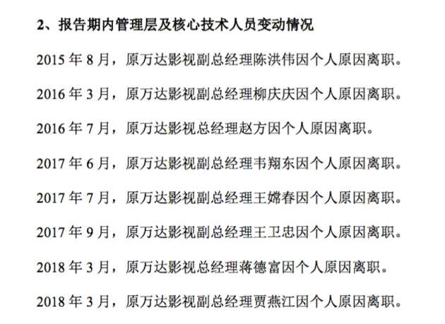 (萬達影視集團高層變動頻繁,2015年8月~2018年3月已有2任總經(jīng)理、6任副總經(jīng)理相繼離職)