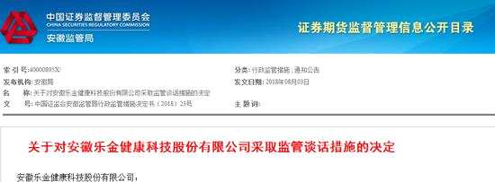 根據(jù)《上市公司信息披露管理辦法》第五十九條,我局決定對你公司采取監(jiān)管談話的行政監(jiān)管措施,并根據(jù)《證券期貨市場誠信監(jiān)督管理暫行辦法》將相關(guān)情況記入誠信檔案?,F(xiàn)要求你公司董事長金道明、財務(wù)總監(jiān)汪燕、董事會秘書梁俊于2018年8月8日下午3時攜帶有效身份證件到安徽證監(jiān)局(合肥市高新區(qū)天波路6號)223室接受監(jiān)管談話。