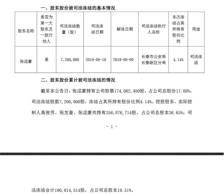 截至本公告日,張洺豪持有公司股票174,062,400股,占公司總股份17.88%,司法凍結(jié)股數(shù)7,200,000股,凍結(jié)占其所持有股份比例4.14%??毓晒蓶|、實際控制人高俊芳、張友奎、張洺豪共持有356,876,714股,占公司總股本36.65%;司法凍結(jié)合計190,014,314股,占公司總股本19.51%。