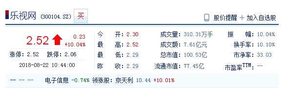訊8月22日消息,樂視網(wǎng)(300104)高開高走,截止10點(diǎn)29分,樂視網(wǎng)股價(jià)再度封漲停,封單超32萬(wàn)手,報(bào)2.52元。
