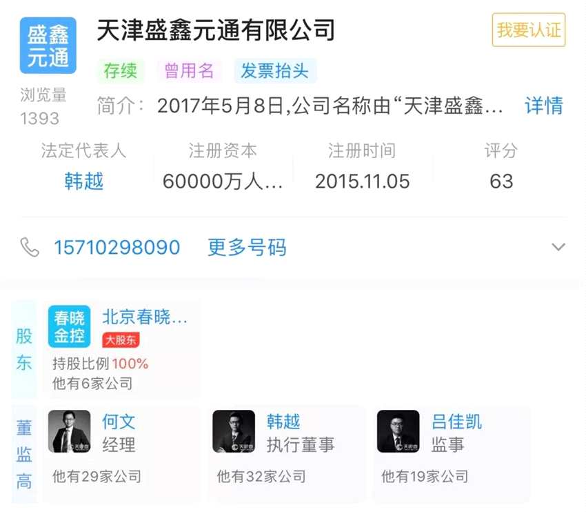 天津盛鑫是九有股份的第一大股東。天眼查顯示,天津盛鑫由北京春曉金控科技發(fā)展有限公司100%控股,韓越是其執(zhí)行董事,同時韓越也是春曉金控的實際控制人,持股86.8%。