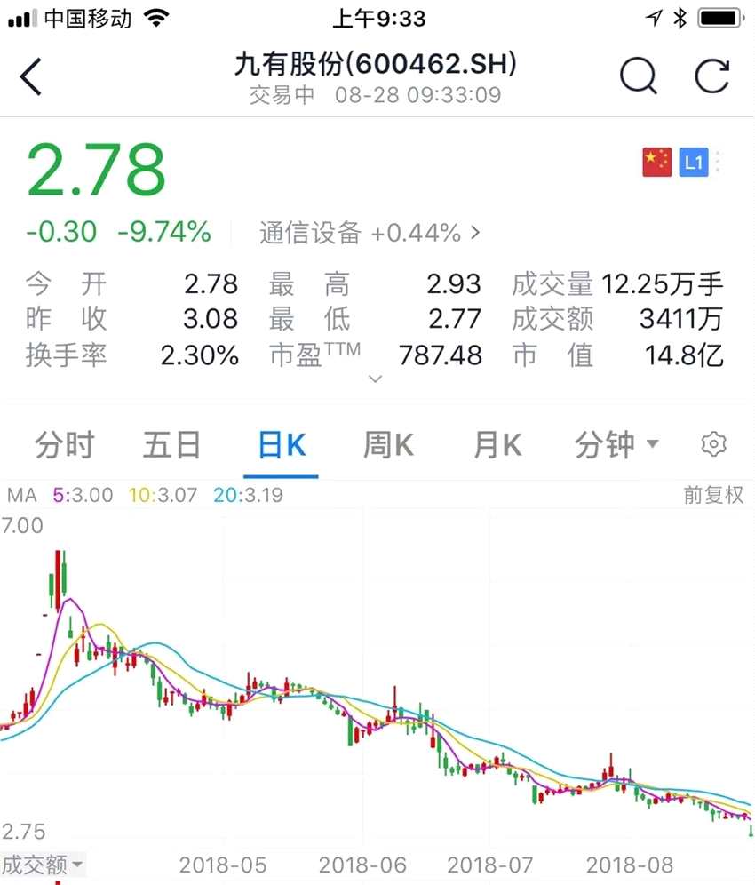 自春曉資本入主以來,九有股份的股價也伴隨大市情況一路走低,目前最新價2.8元左右,相比于2017年9月的階段性最高點6.59元/股大幅下跌。