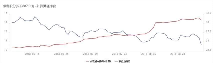 而通過數(shù)據(jù),我們也發(fā)現(xiàn)了一個(gè)有趣的現(xiàn)象。那就是7月30日是一個(gè)重要的拐點(diǎn),當(dāng)天伊利股份報(bào)收26.69元,而滬股通席位持有股份占公司流通股的比例是11.74%。一個(gè)月后的8月31日,伊利股份的股價(jià)已經(jīng)下跌至24.20元,跌幅接近10%,但滬股通席位持有股份占公司流通股的比例卻提高至13.36%。