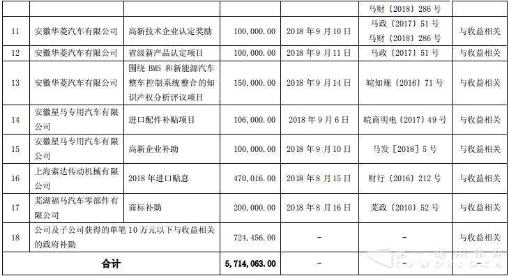 公告顯示,華菱星馬汽車(集團(tuán))股份有限公司(以下簡(jiǎn)稱“公司”或“本公司”)及子公司自2018年4月1日至2018年9月30日期間,累計(jì)收到各類政府補(bǔ)助合計(jì)5,714,063.00元,占公司2017年度經(jīng)審計(jì)的歸屬于上市公司股東凈利潤(rùn)的10.23%。具體明細(xì)如下: