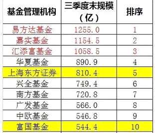 富國(guó)基金三季度末規(guī)模為544.4億元,排名第十。